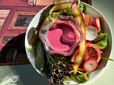 This breakfast is a delicious combination of flavors and textures that will wake up your taste buds and get your day started right! It begins with a toasted slice of bread topped with figs, cream cheese, seasonal berries, and walnuts. Then, it's drizzled with honey and served with a side of scrambled eggs to complete this delightful breakfast experience!