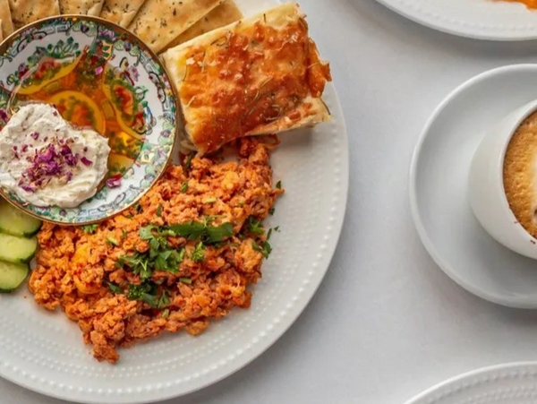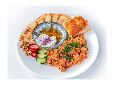 The Mediterranean Breakfast Platter is a traditional tomato omelet accompanied by a variety of sides that include avocado, dates, walnuts, feta cheese, fresh cucumber, fresh tomato, and fresh seasonal fruit. The platter is served with warm bread and honey. The flavors of the omelet, avocado, dates, walnuts, and feta cheese are complemented by the fresh cucumber and tomato. The fresh seasonal fruit provides a sweet contrast to the savory flavors of the platter.